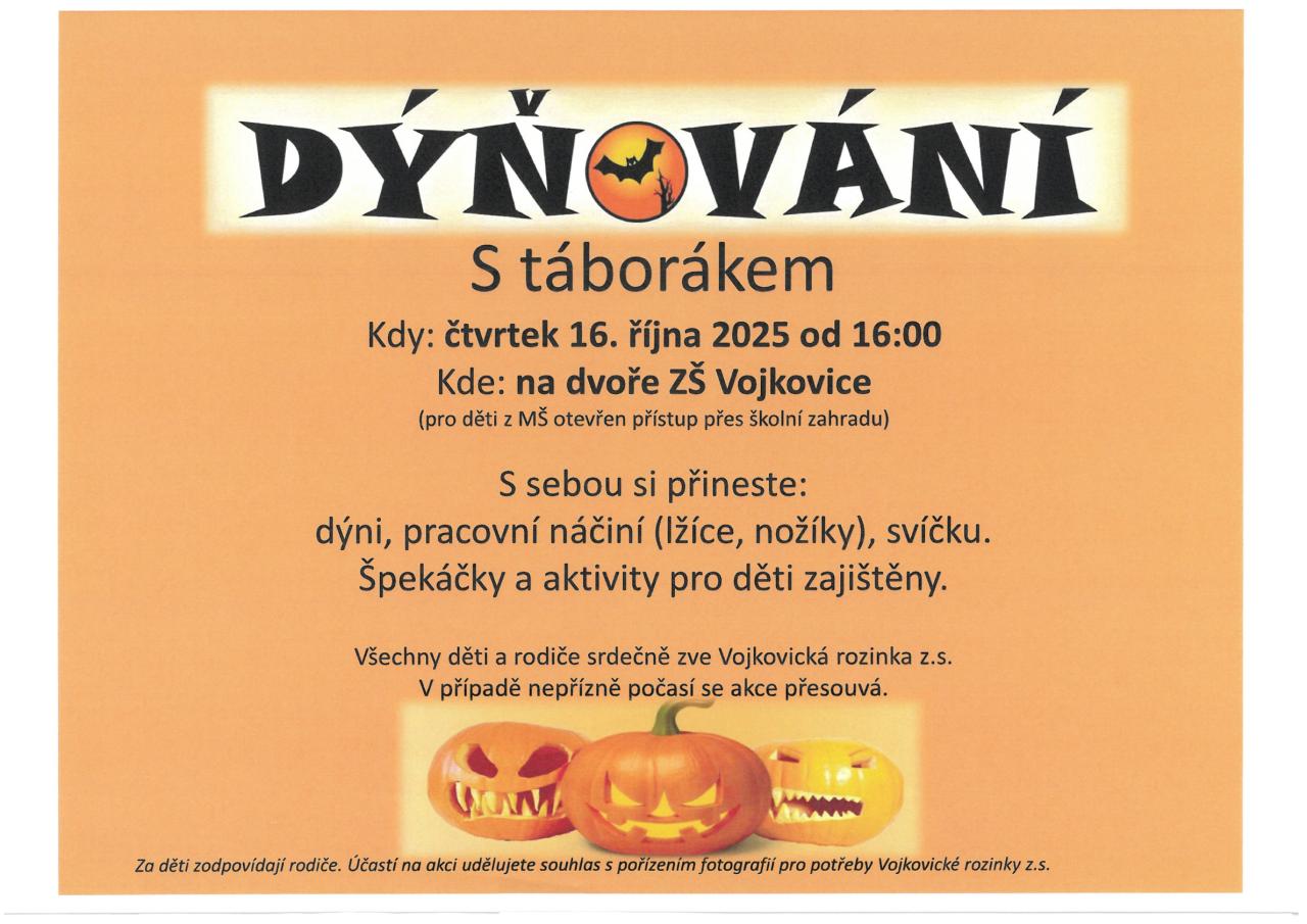 Vojkovická rozinka z.s. zve na DÝŇOVÁNÍ s táborákem, které se uskuteční ve čtvrtek 16. 10. 2025 od 16:00 hodin na dvoře Základní školy Vojkovice.