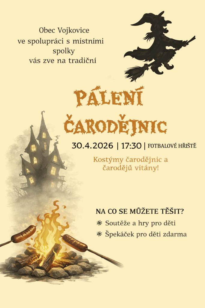Tradiční pálení čarodějnic v areálu fotbalového hřiště ve Vojkovicích - 30. 4. 2026.